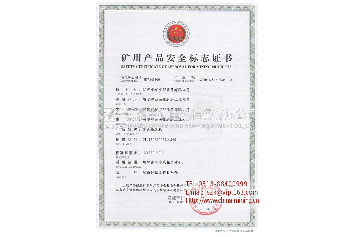 DTL160 Belt Conveyor - Mine Product Safety Mark Certificate