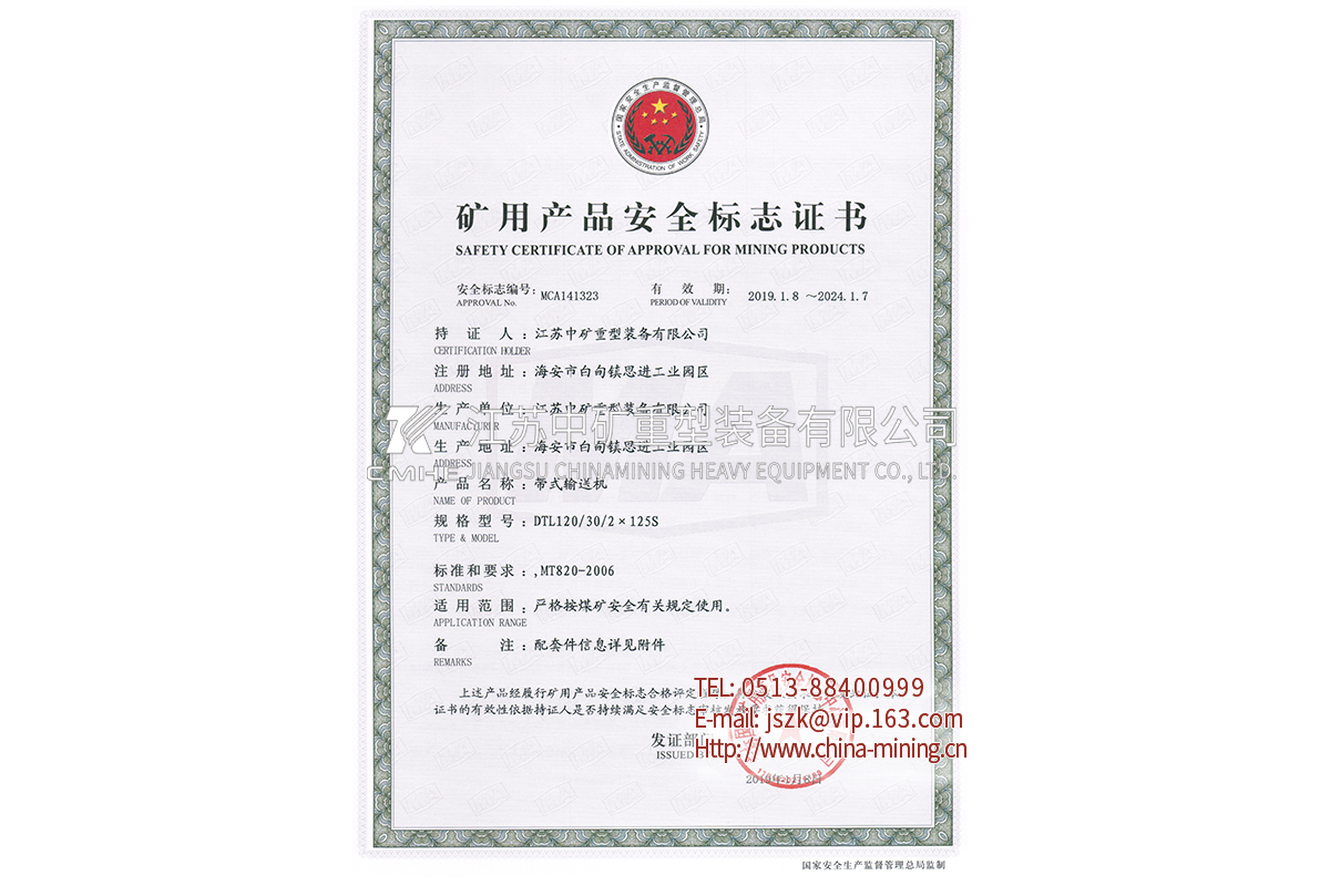 DTL120 Belt Conveyor - Mine Product Safety Mark Certificate